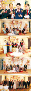 圖一左起:坤方福證人李桂雄先生,乾方福證人徐惠深先生致賀詞。坤方家長張楚宣先生,乾方家長吳懷智致謝詞。圖二:乾方福證人潮館主席徐惠深徐黃麗華賢伉儷,坤方福證人中總副主席,潮陽同鄉會理事長李桂雄李郭小燕賢伉儷,坤方家長張楚宣張劉琪真賢伉儷,乾方家長吳懷智吳周嬋琴賢伉儷聯合為准新郎承興君與澤婉小姐主持文定納彩禮。圖三:六位主持人文定納彩儀式。圖四:潮館徐惠深主席暨夫人黃麗華,崇德善堂董事長李振欽,僑領周金順,周振炎見證文定典禮。圖五:諸首長徐惠深,李桂雄,李振欽,李永根,周振炎,周隆光,周金順,李嘉淳,向男方家長吳懷智及准新人祝賀。圖六:徐惠深徐黃麗華賢伉儷,李振欽,周隆光周顏瓊瑛賢伉儷,周金順周吳惜音賢伉儷,周振炎周陳麗麗賢伉儷等向男方家長吳懷智吳周嬋琴賢伉儷致賀並合影。圖七:李桂雄,林瑋,張楚南,陳國鑫,李大成等合影。圖八至九:准新娘新郎與家族合影。 |