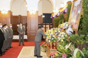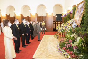 | 一元伊始,萬象更新,二0二三年元旦豔陽高照,泰國潮州會館主席徐惠深暨名譽主席林楚欽,陳錫源,永遠名譽顧問劉秉青,副主席徐光輝,李桂雄,蕭俊傑, 邱燕桂,李創福,劉漢明,常務秘書蕭漢銘,陳焯輝,黃玉枝,常務稽核陳鴻輝及辦公廳職員等一行,專程前往大皇宮,恭向泰皇陛下暨皇后禦像呈獻花籃,行最崇高鞠躬禮,簽名恭祝政躬康泰,國運昌隆,國泰民安! |