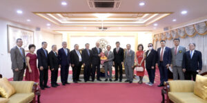 2023年2月2日上午十時,泰華進出口商會理事長林齊銳,副理事長劉漢明,副理事長李耀深、王慶招、蔡衍孝、鄭偉中,常務理事林瑋、陳金敦,總幹事孫木松一行蒞臨訪問泰國潮州會館。受到泰國潮州會館主席徐惠深,副主席徐光輝、鐘燦峰博士,常務秘書鄭定沛、黃玉枝,總幹事吳學聰等的熱情歡迎。其中,劉漢明先生和林瑋先生也皆是潮館的副主席,蔡衍孝先生是潮館的常務秘書,王慶招先生是潮館的常務財政,李耀深先生是潮館的執委。賓主在泰國潮州會館二樓朝鎮廳進行親切座談。
