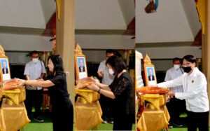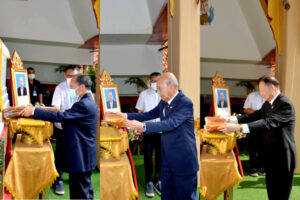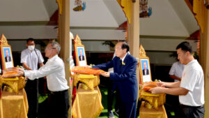 圖一:恭請潮州會館主席徐惠深主持贈火儀式。圖二:僑領徐惠深主席,陳振治博士,蕭廷里獻袈衫。圖三:坤巴實,吳金城,吳學聰等獻袈衫。圖四:坤甫沖,坤差綠,坤立素鐵蓬等獻袈衫。圖五:數百親友參加贈火。
