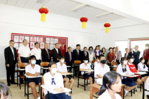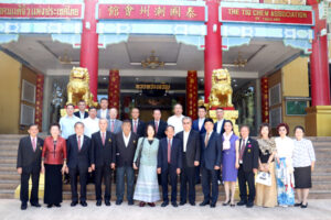 中國全國政協代表團,由全國政協港澳台僑委員會駐會副主任王偉閣下為團長,團員有全國政協委員,港澳台僑員會僑委會委員劉以勤,朱碧新,周春玲,辦公室副主任張武軍,辦公室華僑處處長鄧衛星等一行,於公元2023年7月6日上午,在中國駐泰大使館劉敬師參贊,張秘書的陪同下蒞訪泰國潮州會館,傾聽僑界聲音,考察潮館轄下潮州中學,親身感受該校中文示範課,了解該校在弘揚中華文化,促進中泰文化交流,增進民心相通啟到作用。