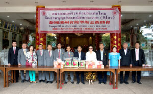 徐惠深主席主持潮州会馆盂兰胜会施阴济阳 延僧诵经保合境平安为二千贫民放发生活包 现场锺木强乐助廿万铢刘秉青乐助一万铢连前诸首长共计乐助七十一万铢善款 邱燕桂李创福徐金亮倪武龙郑定沛陈焯辉蔡衍孝黄玉枝方松坚廖令金吴炳林等