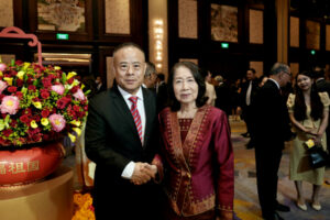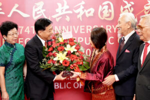 中國駐泰國大使韓志強夫婦9月20日晚在曼谷香格里拉酒店舉行慶祝中華人民共和國成立74週年招待會。泰國政府高官及部分政黨領袖,外國駐泰使節、華僑華人、中資機構代表,僑團首長;泰國中華總商會主席林楚欽,永遠榮譽主席劉錦庭,陳振治,榮譽主席謝國民,副主席李桂雄、陳錦源、何克家、蔣應初、劉秉青;泰國潮州會館永遠名譽主席李光隆、陳漢士、榮譽主席陳紹揚、代主席夢莉、副主席廖漢明、劉漢明、許鎮南、李先棟、鄭岳龍、蕭俊傑、黃烈凱、徐位合、孫石波、蔡蔚生,首長羅宗正、林俊然、蔡百山(沛訕)、郭光國、吳紹勤、老軍人劉鎮傑、林嘉南、陳卓欽、鄭惠中、林木堅、陳榮新、陳淑卿、陳淑華、鍾愛祥、蕭漢銘、鄺錦榮、徐永添、徐名雙、王志民、吳炳林、陳鑫哲、林瑋、李紹祝、陸少濱、張俊明、張步青、謝程財、謝崇通、李炎炎、何寶才、羅豪傑、林偉、呂木龍、馬燦利、廖翠珍、錢豐、馬文北、林慰民、陳運金、黃增濱、陳焯輝、陳鴻輝、陳金敦、羅兩德、徐位常、張讓源、傅文通、陳松深、許培松、王嘉鵬、李映民、鄭秀銳、孫木松、魏東莉、鄭炳克、林少懷、林少利、中華日報社長陳正博士等各界人士出席共申慶祝。