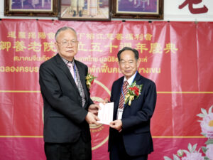 茲誌出席並贊助養老院經費單位及個人:泰國中華總商會50萬銖,豐發有限公司、徐光輝榮譽院長、曾山帝榮譽院長、泰國潮州會館各20萬銖,TOA集團董事長陳運樓15萬銖,蔡漢強榮譽院長、暹羅五金公會各10萬銖,泰華進出口商會、鄭岳龍先生、周振炎副院長、林耀烈先生、鄭惠中先生各5萬銖,楊鵬英常務委員3萬銖,王金龍先生、方松堅先生、華僑報德善堂各2萬銖,陳茂松先生、陳成傑、鄭定沛、王木嬌、呵叻分會、帕府分會、彭世洛分會、清邁分會、喃邦分會、馬逸群先生、王潮先生各一萬銖,吳德實陳佩娟、洪真武陳佩芳、林鴻浩榮譽顧問、鄧小英、鍾愛祥、徐名雙、許景杓、劉興源賴任群榮譽顧問各5千銖,陳金城莊惠蘭4千銖,楊瑞隆理事、廖翠珍女士各二千銖,郭錦端1千銖,仁風善舉,殊堪偯揚。