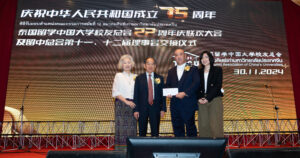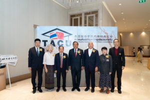 2024年11月30日上午,潮州會館徐惠深主席暨諸位首長,前往光華堂參加泰國留學中國大學校友會總會22周年慶聯歡大會及總會第11-12屆交接儀式,謝均鴻先生眾望所歸,榮膺為第12屆理事會主席,本次交接典禮儀式受到中國駐泰國大使館和文化教育界的高度重視,韓志強大使在致詞中給予留中校友會高度的讚揚和肯定,並希望留中校友會再接再勵,為泰中的文化教育做出新的貢獻!徐惠深主席在致詞後,率領參加活動的潮館全體首長登台獻上祝福鮮花並贊助十萬銖作為發展留中的各項費用。中午,在謝均鴻主席的熱情和豐富的午餐後,宣佈就職典禮儀式圓滿結束!